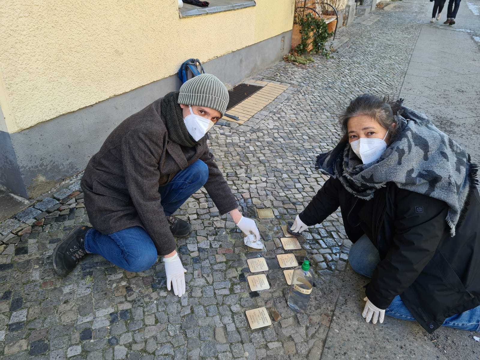 Beutel mit Putzutensilien wurden bereitgestellt und ein individueller Straßenplan vorbereitet um die Infektionsgefahr so gering wie möglich zu halten und niemanden zu gefährden. In Paaren wurden dann die 114 Gedenksteine geputzt um die Erinnerung an die Opfer nicht verblassen zu lassen.